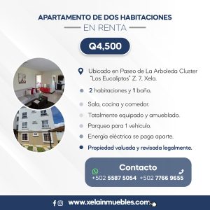 Mostrar toda la descripción - Descripción general: Ubicado en Paseo de La Arboleda Cluster "Los Eucaliptos" Z. 7, Xela. - 2 habitaciones y 1 baño. - Sala, cocina y comedor. - Totalmente equipado y amueblado. - Energia eléctrica se paga aparte. - Propiedad valuada y revisada legalmente. Ubicación: https://maps.app.goo.gl/BGZwBzMAMjSj868D8 Mayor información o cita: 5587 5054 / 7766 9655