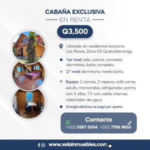 Mostrar toda la descripción - Descripción general: Ubicada en residencial exclusivo Las Rosas, Zona 05 Quetzaltenango. 1.er nivel: sala, cocina, comedor, dormitorio, baño completo. 2.° nivel: dormitorio, medio baño. Equipo: 2 camas, 2 roperos, sofá cama, estufa, microondas, refrigerador, pantry con 5 sillas, TV con cable, Internet, calentador de agua. Energia eléctrica se paga por aparte. Mayor información o cita: 5587 5054 / 7766 9655