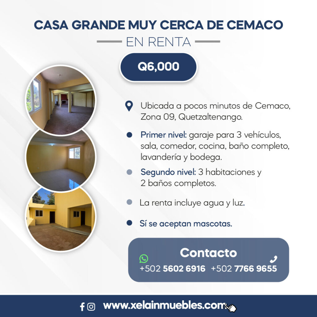 Mostrar toda la descripción - Descripción general: Ubicada a pocos minutos de Cemaco, Zona 09, Quetzaltenango. - Primer nivel: garaje para 3 vehículos, sala, comedor, cocina, baño completo, lavandería y bodega. - Segundo nivel: 3 habitaciones y 2 baños completos. - La renta incluye agua y luz. - Sí se aceptan mascotas. Mayor información o cita: 5587 5054 / 7766 9655