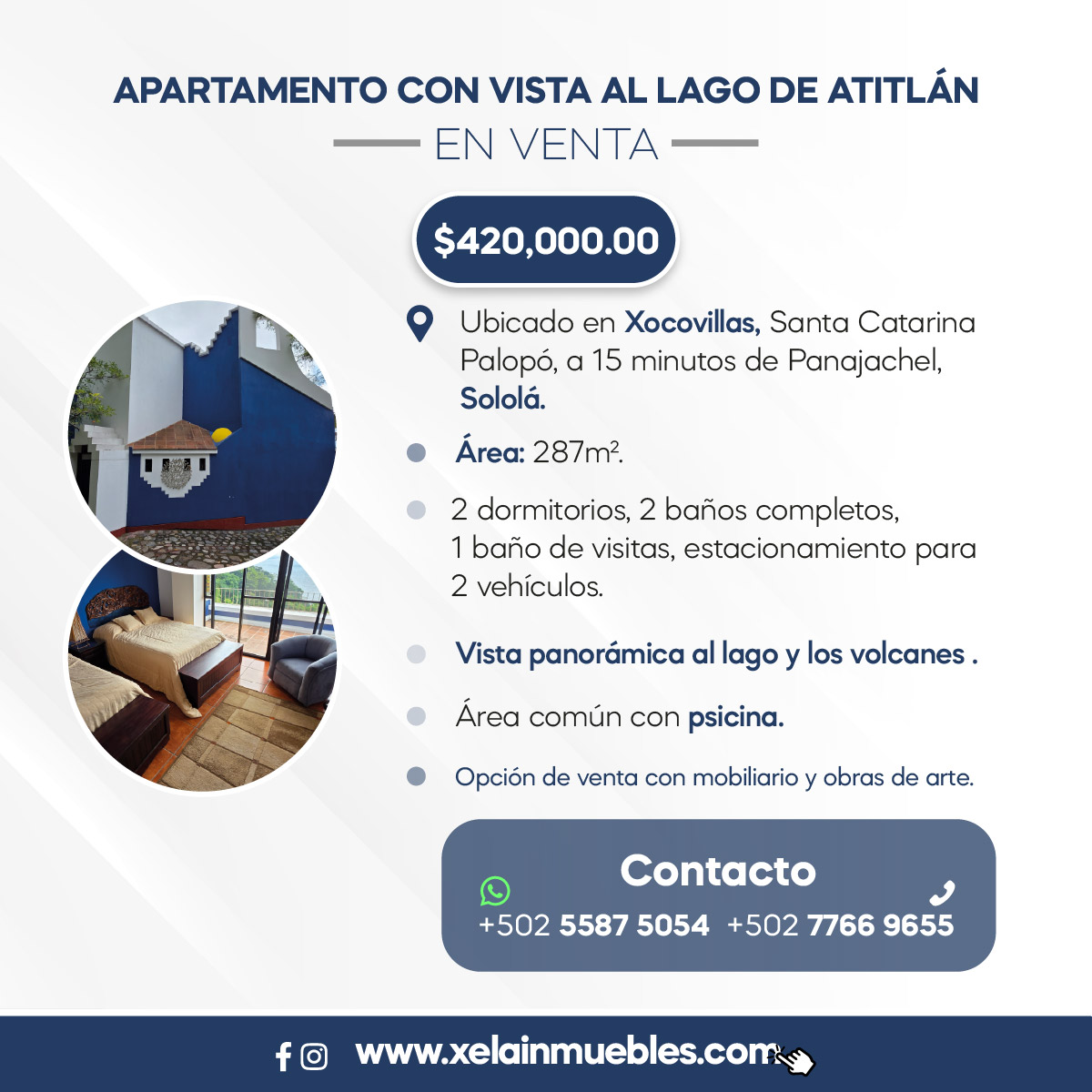 Mostrar toda la descripción - Descripción general: Ubicado en Xocovillas, Santa Catarina Palopó, a 15 minutos de Panajachel, Sololá. Precio en dólares: $450,000.00 Área: 287m² 2 dormitorios, 2 baños completos, 1 baño de visitas estacionamiento para 2 vehículos. Vista panorámica al lago y los volcanes. Área común con psicina. Opción de venta con mobiliario y obras de arte. Ubicación: https://maps.app.goo.gl/FQEPgEY4vATRq5Fz5 Mayor información o cita: 5587 5054 / 7766 9655