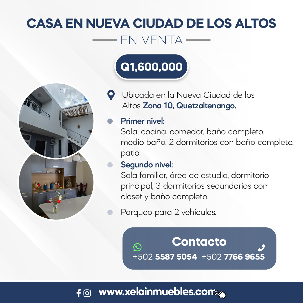 Mostrar toda la descripción - Descripción general: Ubicada en la Nueva Ciudad de los Altos Zona 10, Quetzaltenango. - Primer nivel: Sala, cocina, comedor, baño completo, medio baño, 2 dormitorios con baño completo, patio. - Segundo nivel: Sala familiar, área de estudio, dormitorio principal, 3 dormitorios secundarios con closet y baño completo. - Parqueo para 2 vehículos. Mayor información o cita: 5587 5054 / 7766 9655