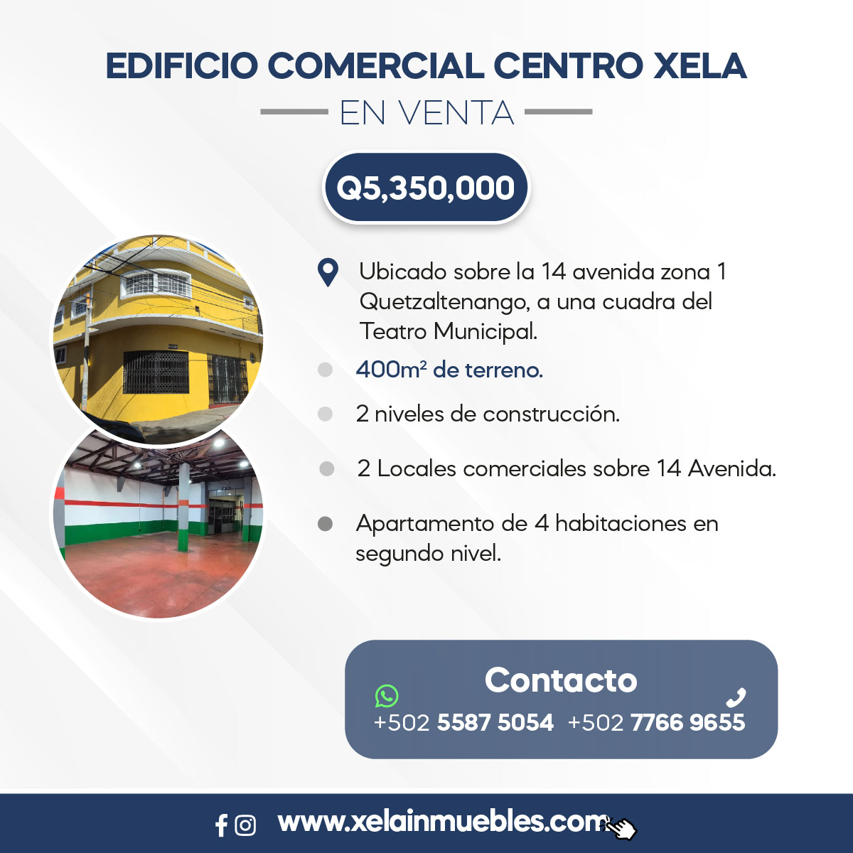 Mostrar toda la descripción - Descripción general: - Ubicado sobre la 14 avenida zona 1 Quetzaltenango, a una cuadra del Teatro Municipal. - 400m2 de terreno. - 2 niveles de construcción. - 2 Locales comerciales sobre 14 Avenida. - Apartamento de 4 habitaciones en segundo nivel. Mayor información: 5587 5054 / 7766 9655