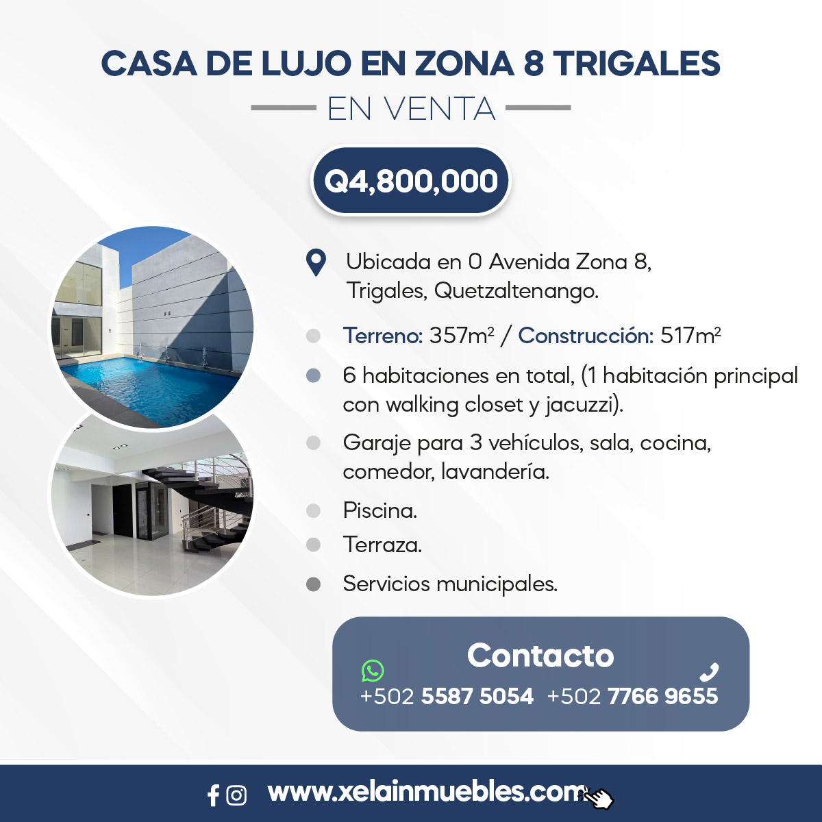 Mostrar toda la descripción - Descripción general: - Ubicada en 0 Avenida Zona 8, Trigales, Quetzaltenango. - Terreno: 357m2 / Construcción: 517m2. - 6 habitaciones en total, (1 habitación principal con walking closet y jacuzzi). - Garaje para 3 vehículos, sala, cocina, comedor, lavandería. - Piscina. - Terraza. - Servicios municipales. Mayor información o cita: 5587054 / 7766 9655