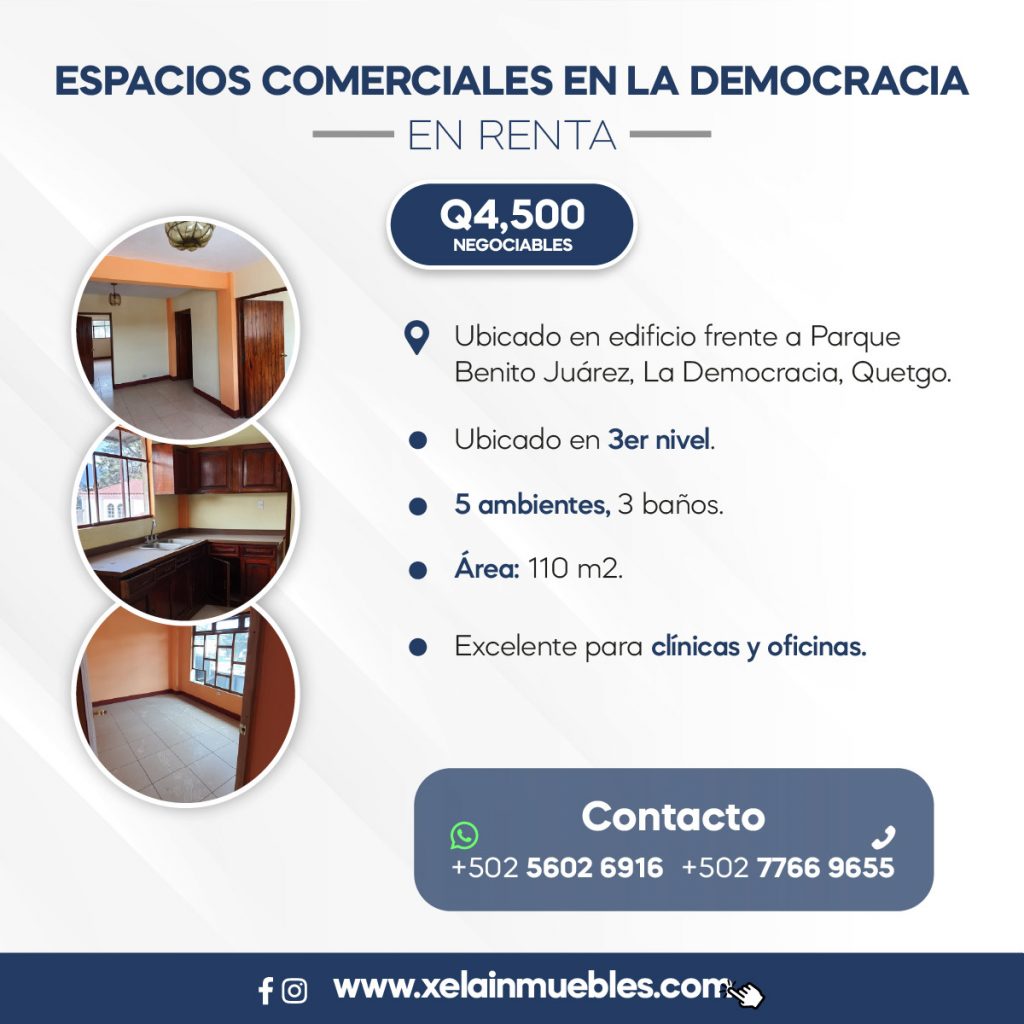 Mostrar toda la descripción - Descripción general: Ubicado en edificio frente a Parque Benito Juárez, La Democracia, Quetgo. - Ubicado en 3er nivel. - 5 ambientes, 3 baños. - Área: 110 m². - Excelente para clínicas y oficinas. Ubicación: https://maps.app.goo.gl/ZsR2XAKCnLkPxtu19 Mayor información o coordinar cita: 5587-5054 / 7766-9655