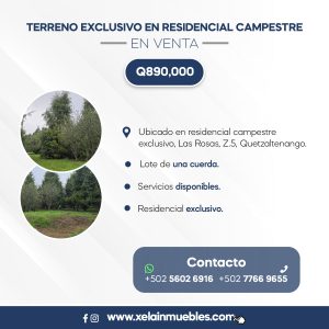Mostrar toda la descripción - Descripción general: - Ubicado en residencial campestre exclusivo, Las Rosas, Z.5, Quetzaltenango. Ubicación: https://maps.app.goo.gl/2vegJb4t2e4imtLB6 - Lote de una cuerda. - Servicios disponibles. - Residencial exclusivo. Mayor información o coordinar cita: 5587-5054 / 7766-9655